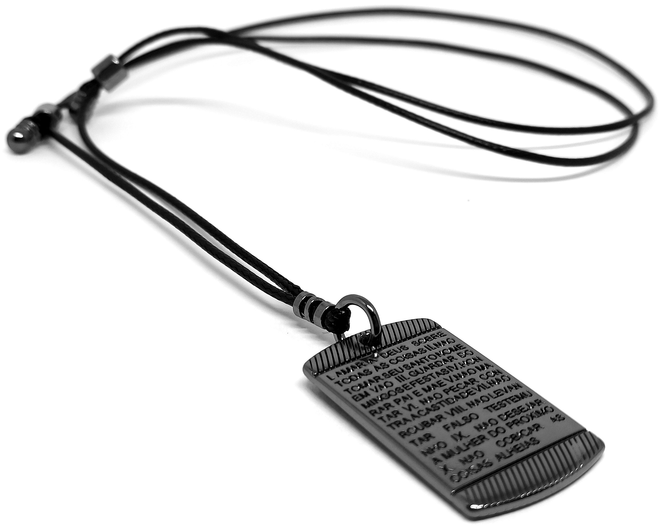Confeccionado em Fio Encerado, possui pingente com banho grafite, trazendo gravados os Dez Mandamentos. Com este colar além da beleza, você sempre trará consigo as leis fundamentais do Cristianismo.