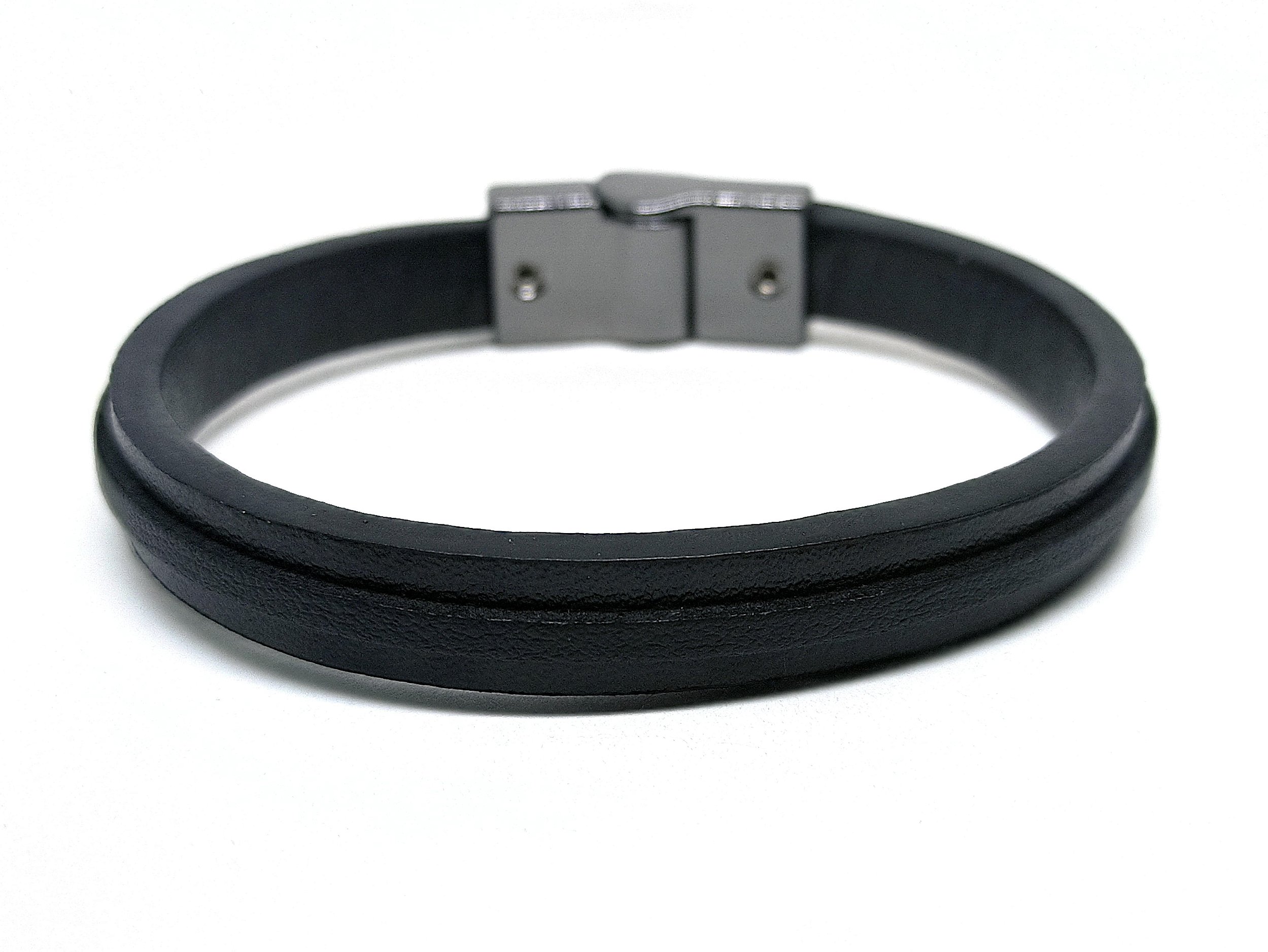 Esta pulseira é uma peça bastante adaptável as mais diversas ocasiões. Composta por Couro preto e fecho magnético com banho grafite.