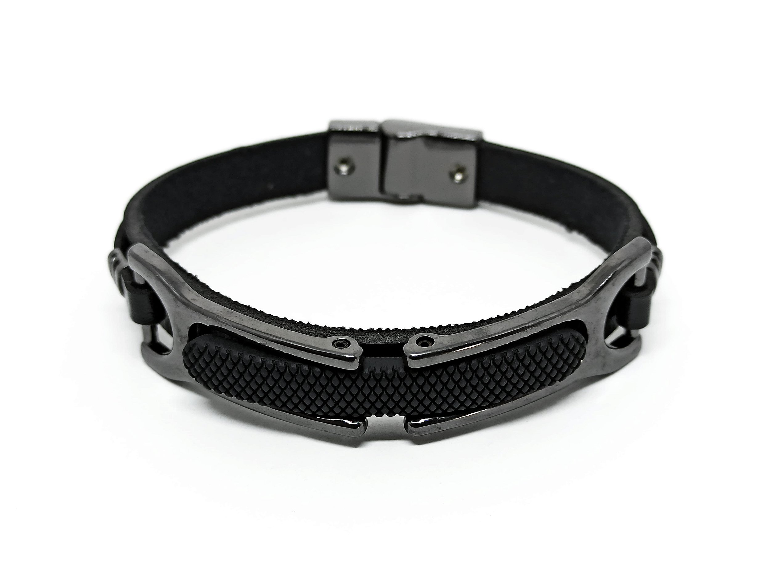 Feita para deixar seus looks excepcionais! Esta peça é confeccionada em Couro preto, possui fecho e argolas com banho grafite e bridão articulado com ABS texturizado, que também leva banho grafite e acabamento escovado.