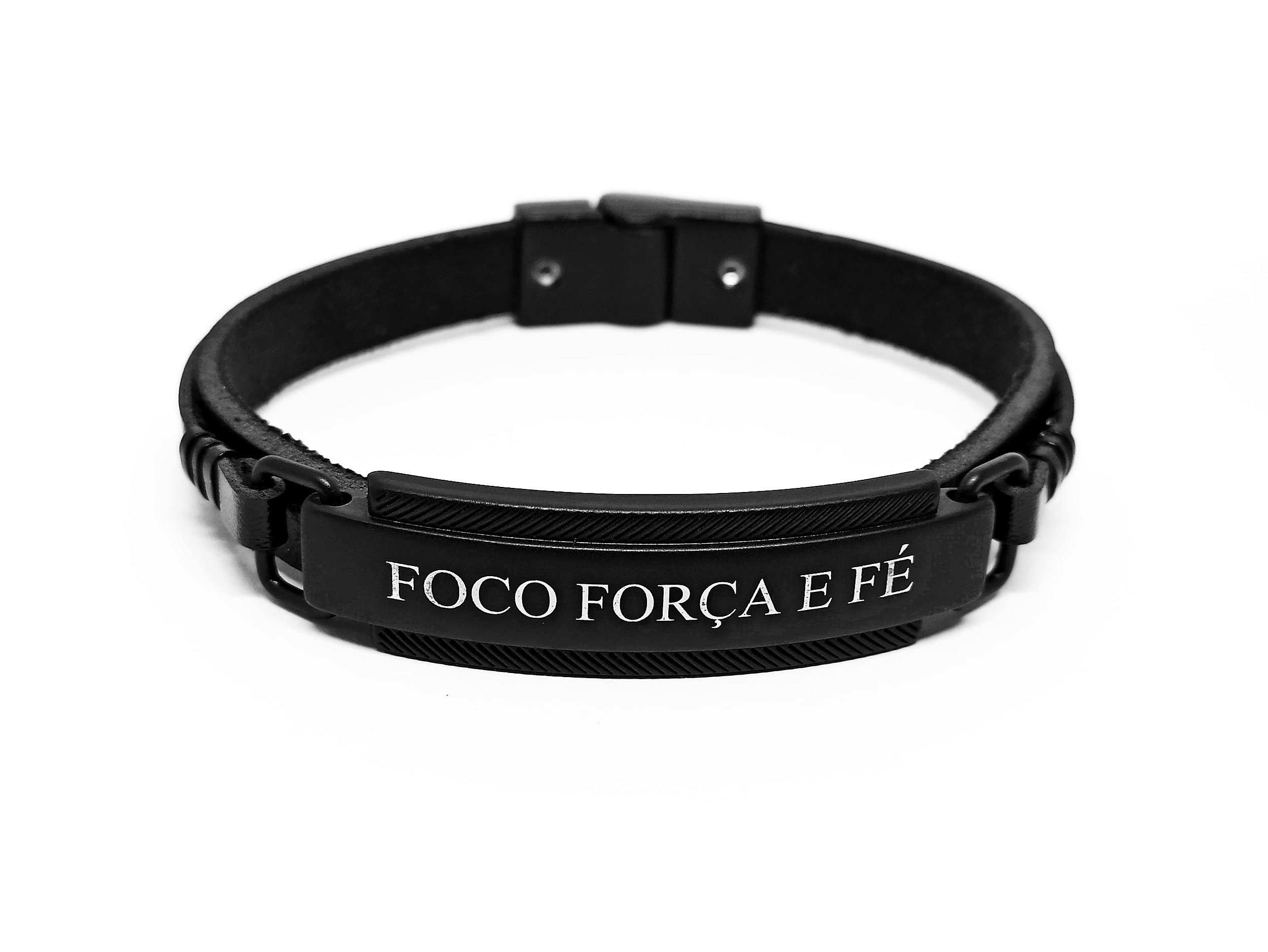 Esta é uma pulseira que, além da beleza, traz incrustadas as três palavras “FOCO FORÇA E FÉ”, um toque de motivação e bom gosto. Composta por Couro preto, bridão, fecho e argolas com banho preto.