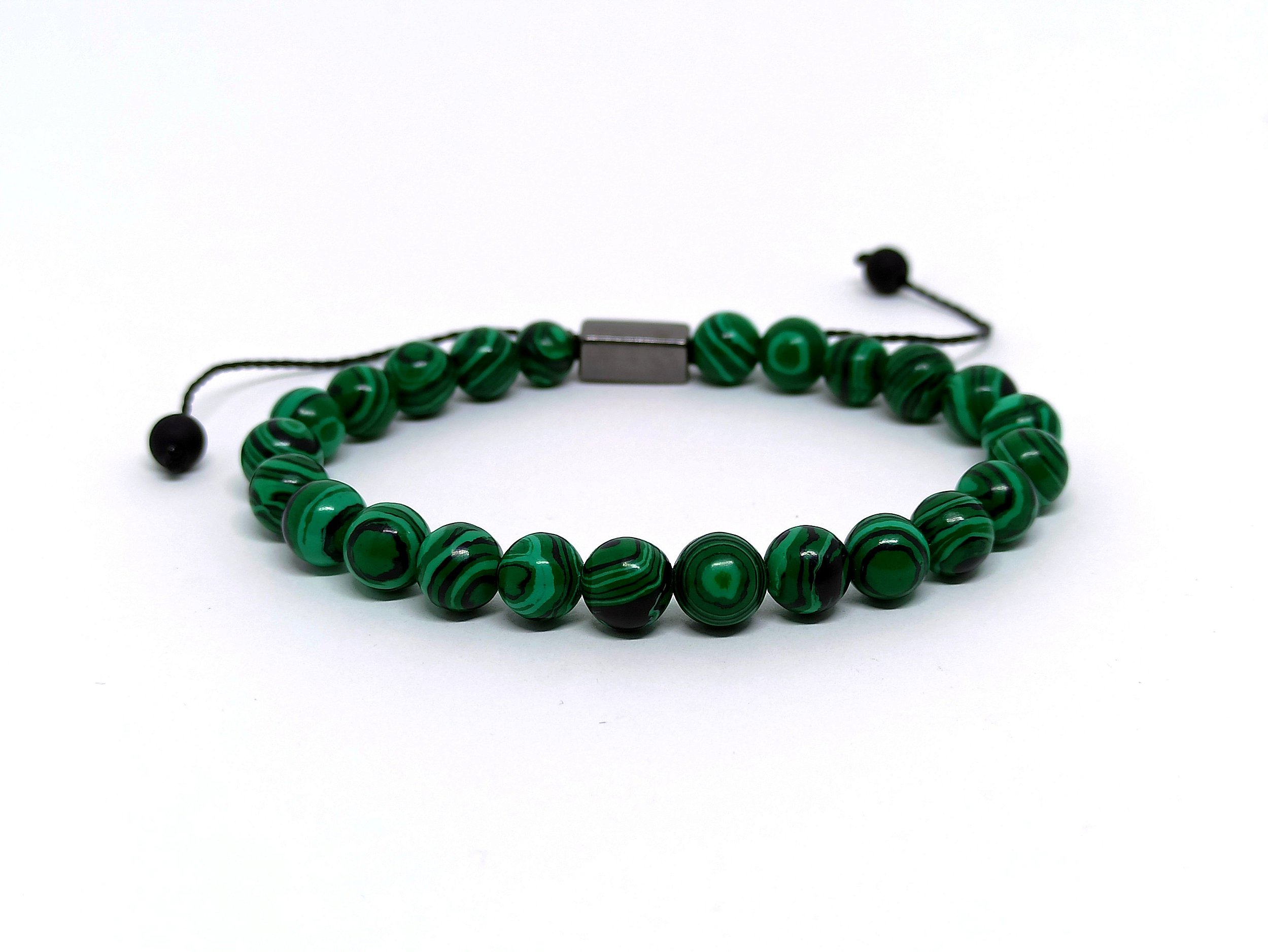 Construída com contas de Malaquita, esta é uma peça rica em detalhes. Graças as várias nuances e camadas de cor desta pedra. Um belo complemento aos mais diversos looks.
